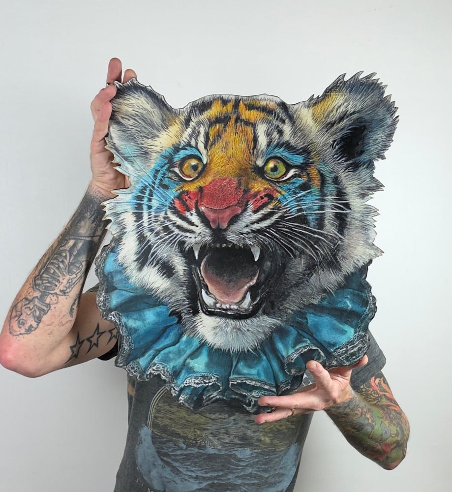 Government power is often described as a paper tiger because, despite its imposing appearance, it ultimately depends on public belief, compliance, and cooperation to function. Laws, institutions, and authority have no force on their own; they rely on citizens, workers, and officials choosing to uphold them day by day. When trust erodes or collective consent weakens, even the most expansive governments struggle to enforce their will without exposing their limitations. Bureaucracy, inefficiency, and overextension can further hollow out power, making it seem formidable in rhetoric yet fragile in practice. In this sense, government authority can appear fearsome and absolute, while in reality it is sustained by social agreement and legitimacy, conditions that, once withdrawn, reveal how easily that power can unravel. Many works in this series consolidate opposites by combining colorful and beautiful with ferocity and danger.