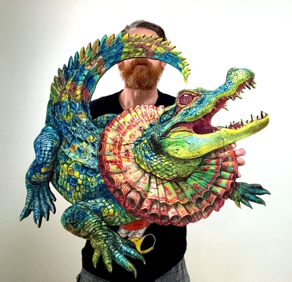 ink, watercolor, acrylic, charcoal, and plaster on wood